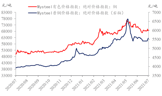 具體來看,6月鋼材消費需求受高溫、雨季、汽車“缺芯”以及部分地區(qū)疫情反復(fù)等因素影響,五大品種表觀消費量環(huán)比下降5.8%,但產(chǎn)量仍小幅增加,庫存連續(xù)三周累庫,總庫存環(huán)比增加76萬噸,鋼材基本面開始走弱,疊加國家相關(guān)部門監(jiān)管加嚴,鋼價承壓下行;著眼有色金屬來看,銅價大幅下跌后,下游采購積極性有所提升,電解銅樣本庫存開始快速去化,但由于宏觀情緒轉(zhuǎn)淡,美指快速上行,在預(yù)期面以及匯率市場上對電解銅價格形成打壓,疊加銅礦供應(yīng)增加,電解銅成本支撐走弱,導(dǎo)致6月銅價震蕩下跌。