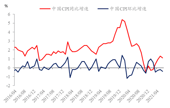 6月CPI指數(shù)同比增速錄得1.1%,環(huán)比增速錄得-0.4%,CPI指數(shù)繼續(xù)溫和下滑。6月CPI指數(shù)持續(xù)下降的主要原因仍在豬肉價格的大幅下跌,跌幅一度高達13.6%,疊加鮮果、蔬菜大量上市,食品價格指數(shù)承壓下跌;而從非食品價格指數(shù)來看,雖然原油價格上漲提高了出行成本,但6月乃是傳統(tǒng)的旅游淡季,疊加部分地區(qū)疫情反復(fù),非食品價格由上月上漲0.2%轉(zhuǎn)為持平。